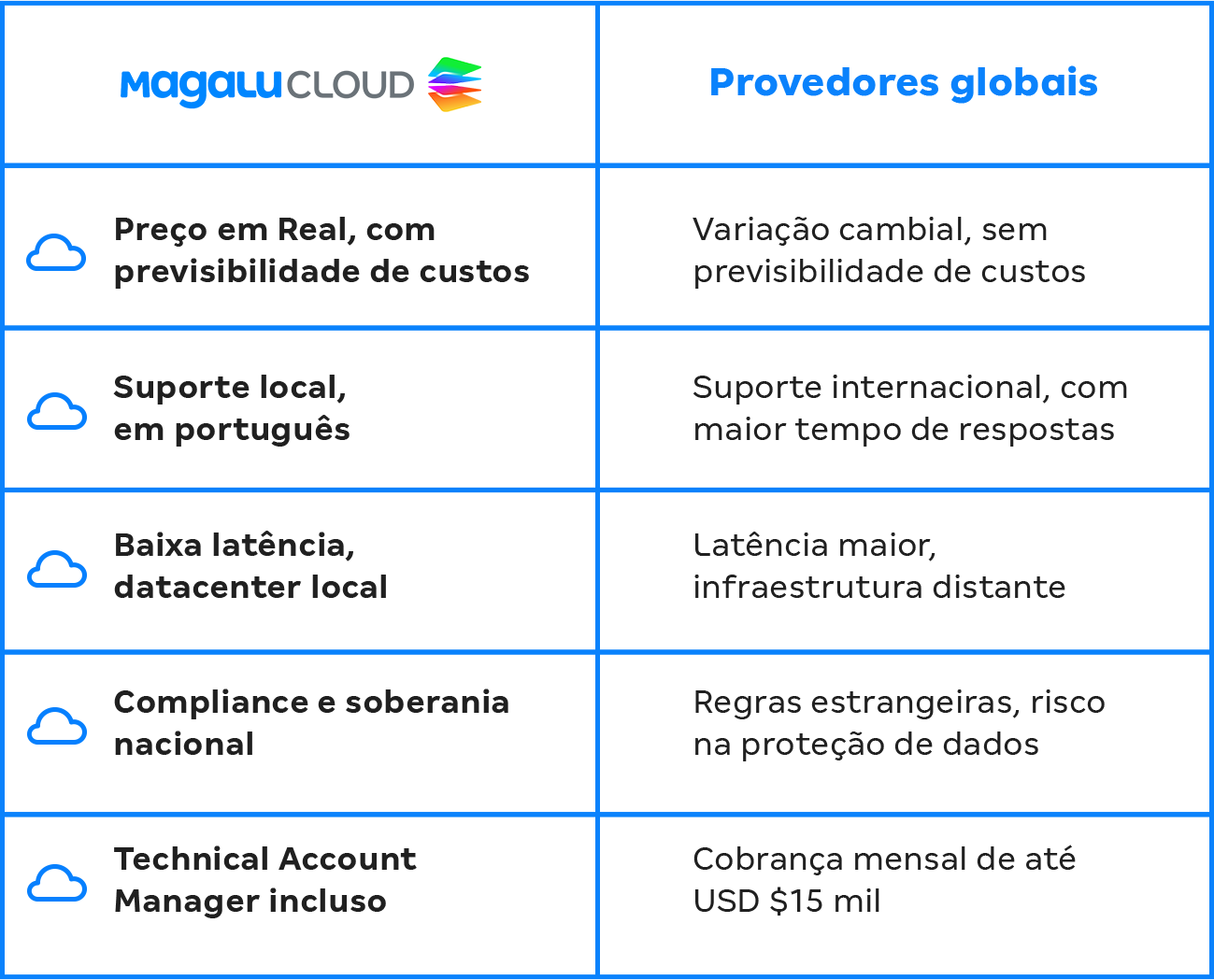 Com a Magalu Cloud, você controla seus custos com preços em real, garante a segurança dos seus dados na infraestrutura nacional. Escale sua operação de forma rápida e confiável, sem depender de variações cambiais ou barreiras internacionais.